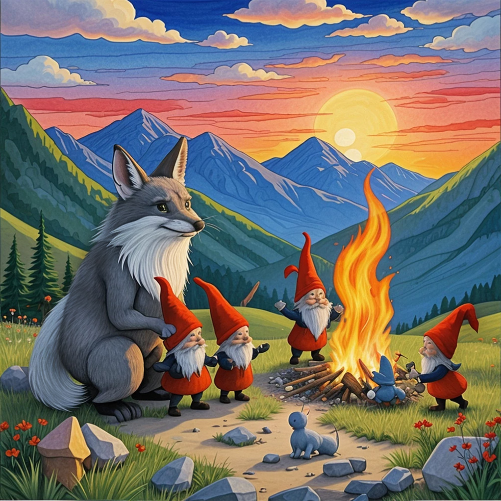 Escena de «Los gnomos y los zorros» (lápiz de color y retoque digital)